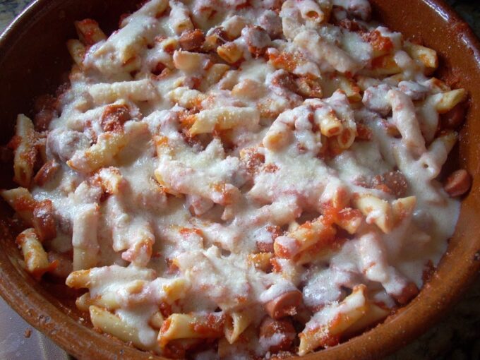 - Echar sobre los macarrones, espolvorear el queso en polvo o rallado por encima y hornear.