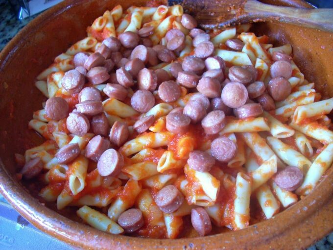 - Mezclar las salchichas con los macarrones y el tomate frito, la cantidad es a gusto.
