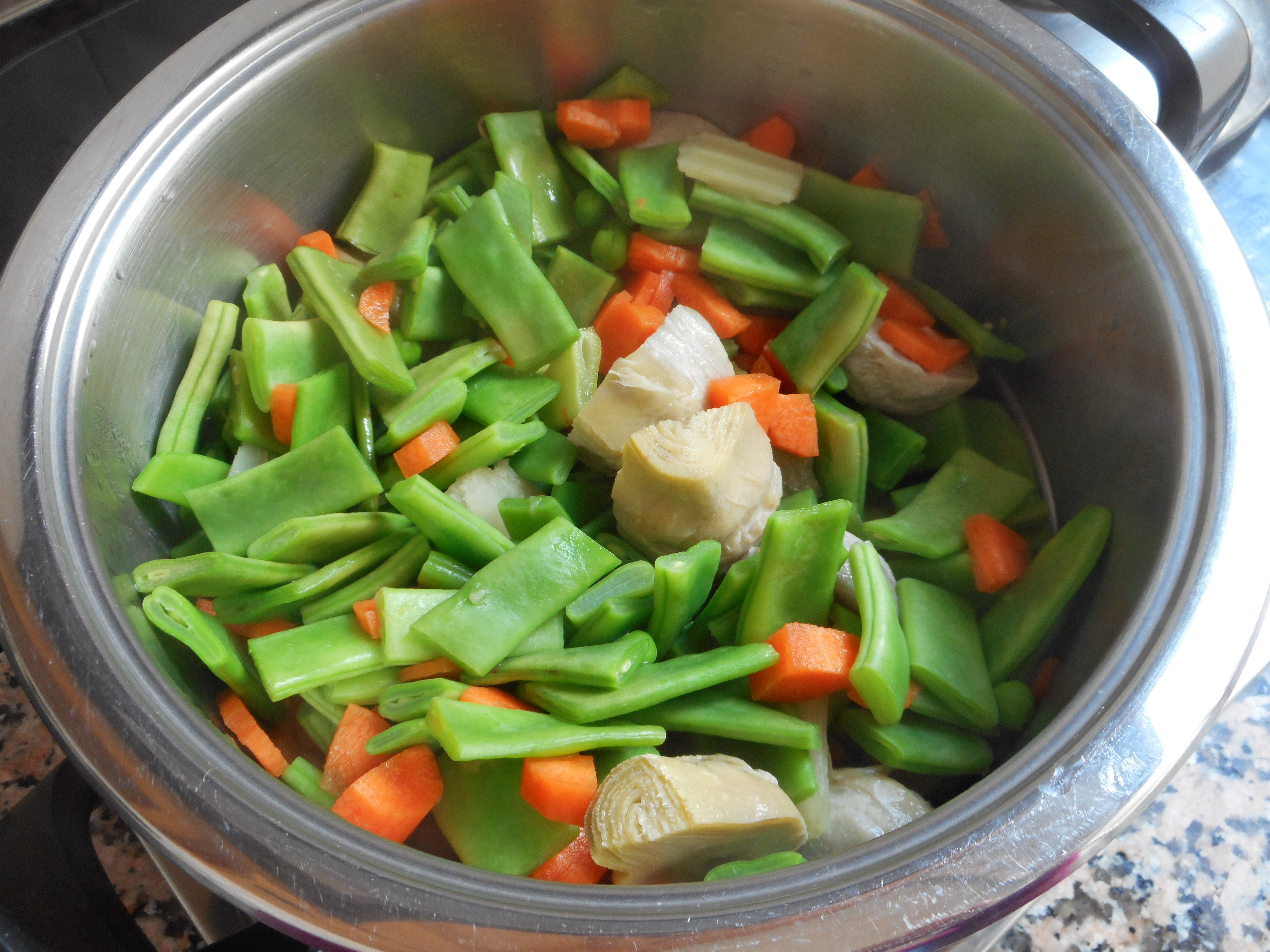 Las judías verdes y zanahorias son frescas, pero los guisantes, el cardo, y las alcochofas son congeladas.