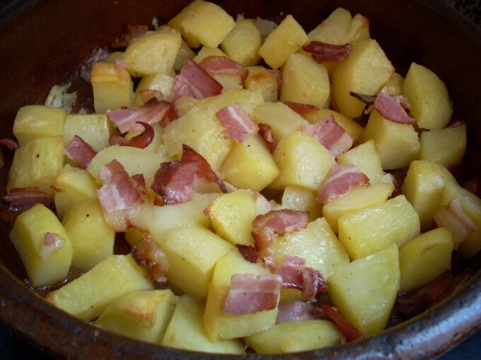 - Patatas, bacon, popurri de pimientas (ya viene preparado), sal y aceite de oliva virgen.